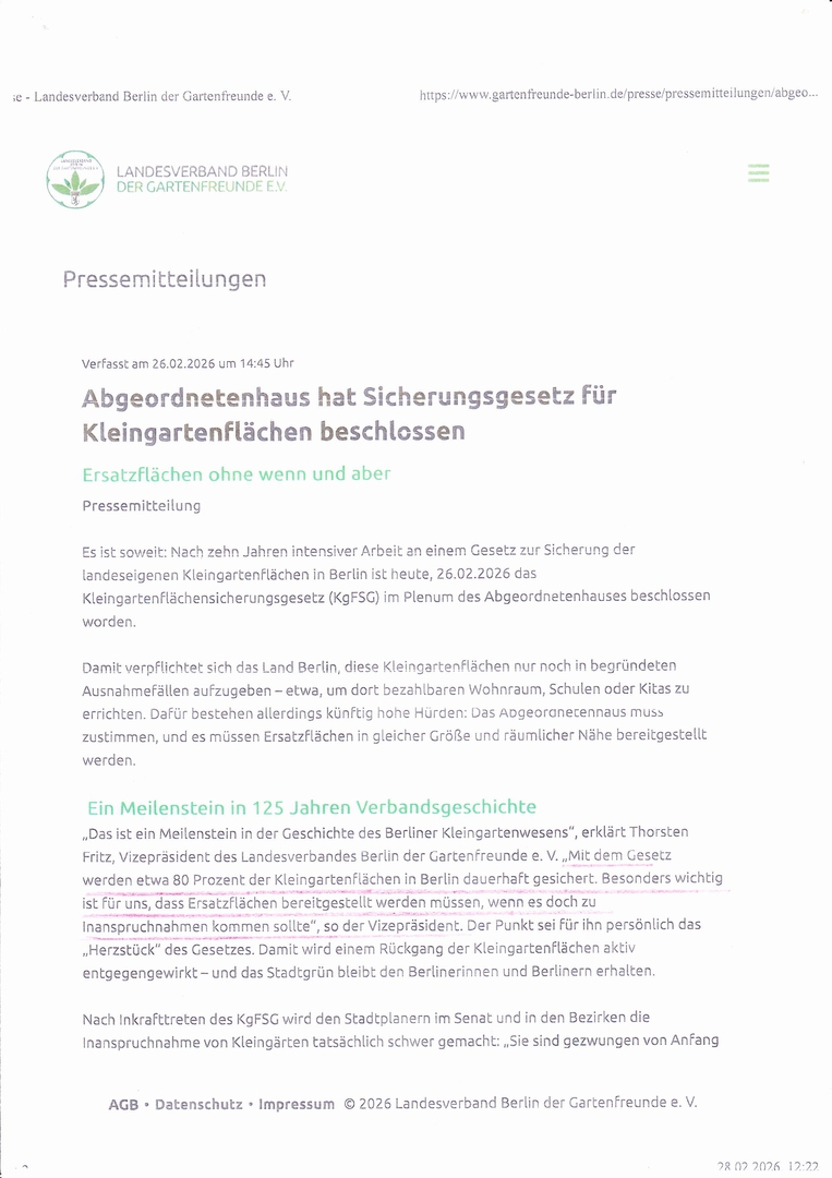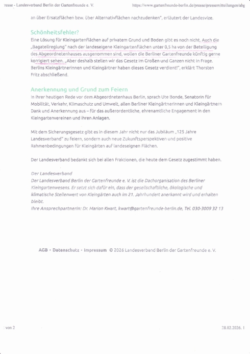 Sicherungsgesetz für Kleingartenflächen 2026
